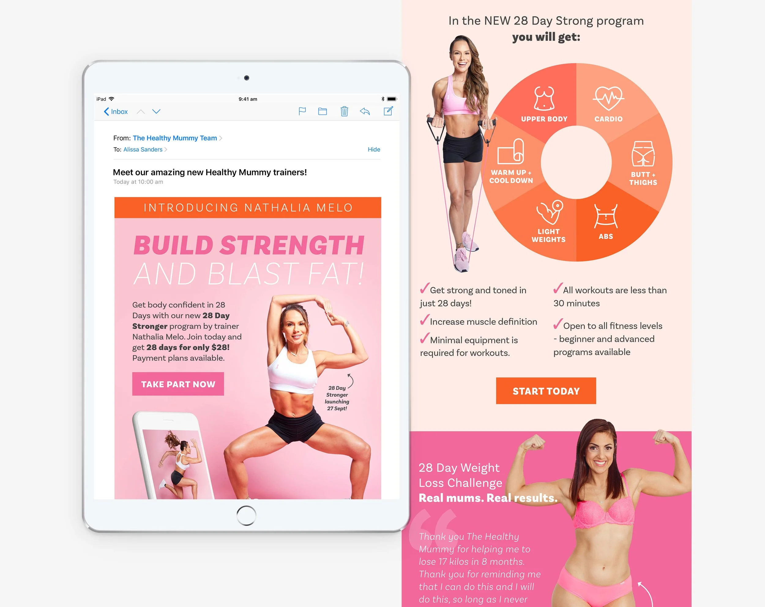 eDM design for various e-commerce lifestyle brands including the Australian fashion brand Autograph, and the health and fitness brand The Healthy Mummy. For Autograph, a modern, clean and feminine design was requested - which was achieved through the use of typography, colour and white space. Bold and contrasting colours, dynamic imagery and bold typography created an eye catching and exciting eDM for The Healthy Mummy, where the aim was to create hype around the launch of a new fitness program.